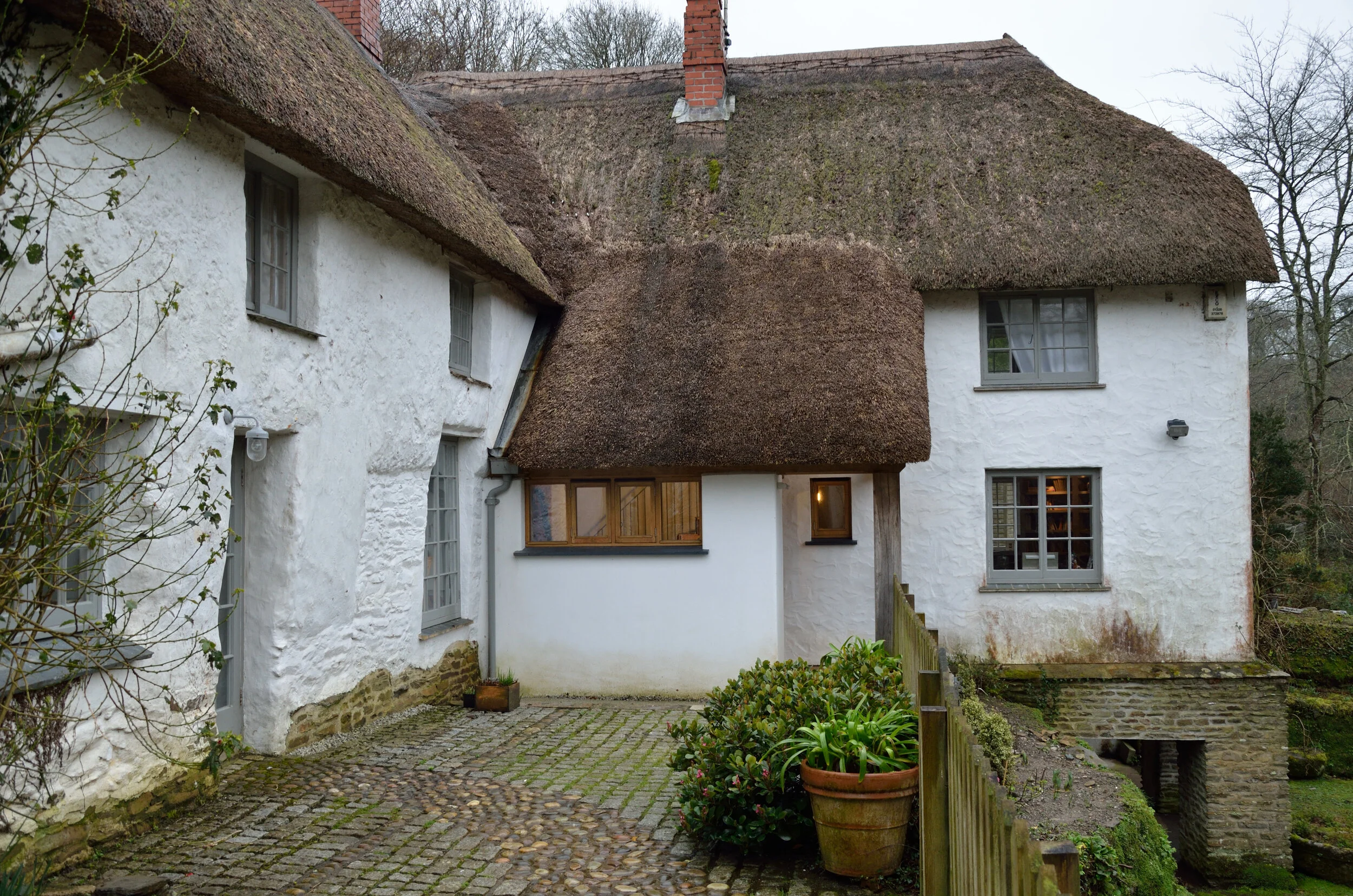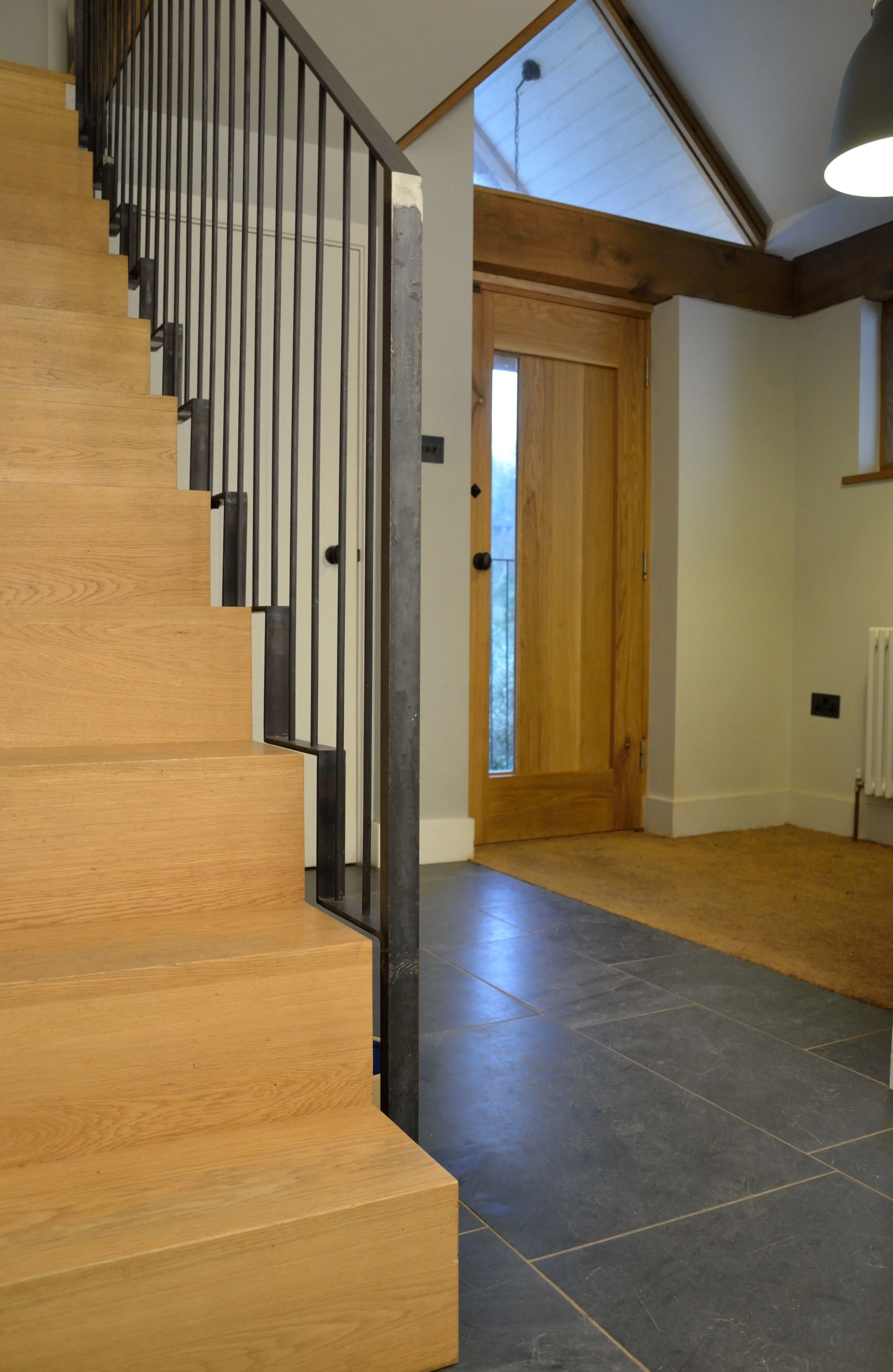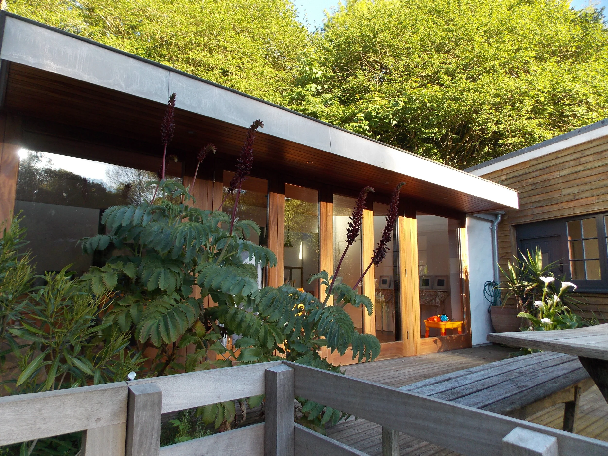 New porch, hall, remodelled kitchen and new conservatory. The new porch and hall on the front of the house provided much needed space for muddy dogs, boots and coats, extending the existing thatch down over a new oak framed extension. An important element in the conservatory was the inclusion of concealed rooflights to wash the three internal walls with daylight - in particular to light the back wall and sideboard for the display of art and objects and also provide plenty of daylight for the Client’s orchids. A palette of dark wood was used, with the floor and ceiling of the conservatory in selected cherrywood; the dark contrasting with walls washed with daylight from the rooflights. Although minor in scale, the project has altered the use of the house: delivering concealed sources of daylight for both artwork and orchids; bringing together the old and new in both materials and form, and providing an intimate relationship with the secluded Cornish valley garden.